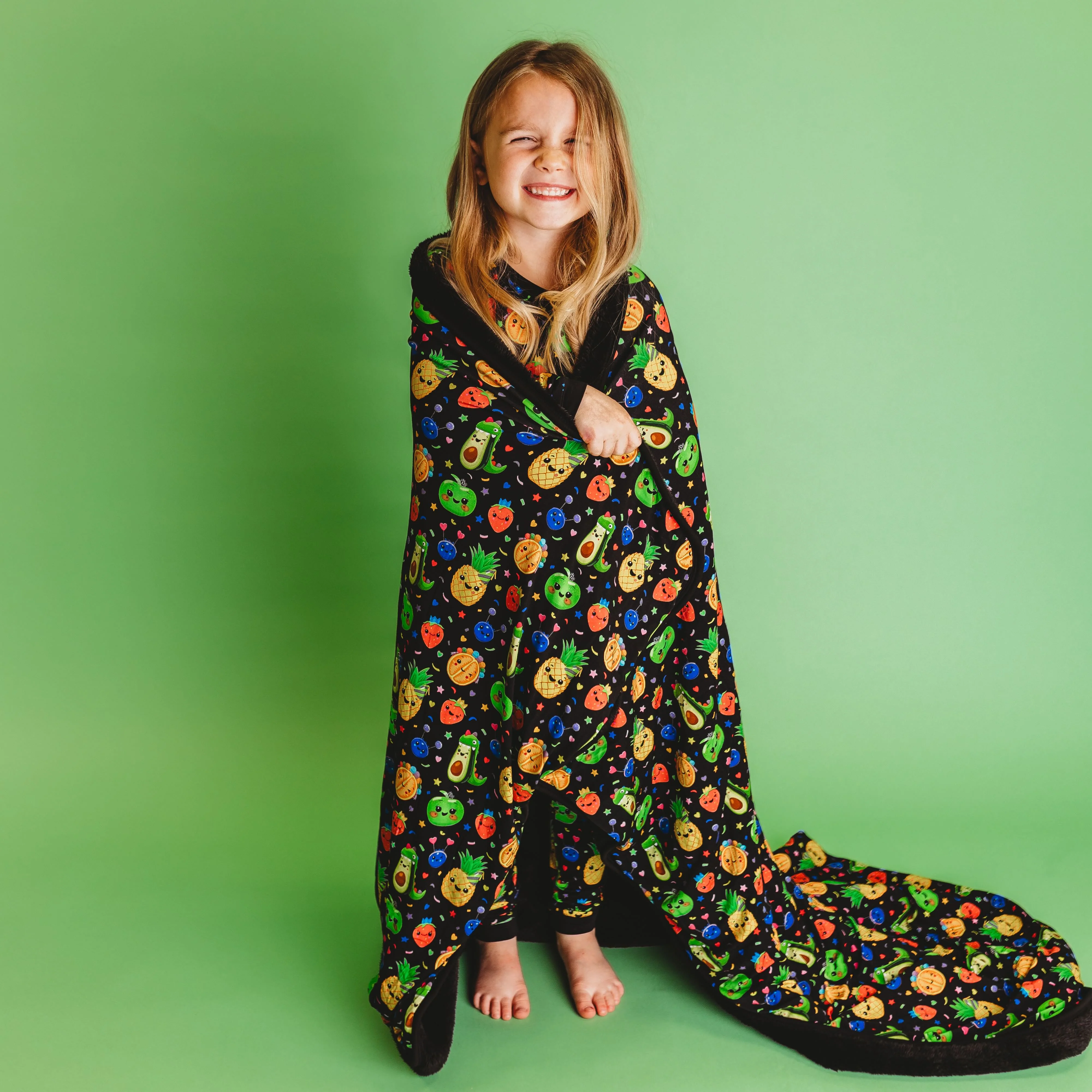 Snuggle up with our gorgeous, super cozy reversible blanket. Comforting, cozy plush one side, buttery soft bamboo on the other and adorned in a fabulous Hey Bear Sensory characters Apple, Blueberry, Strawberry, Pineapple, Orange and Avocadosaurus!