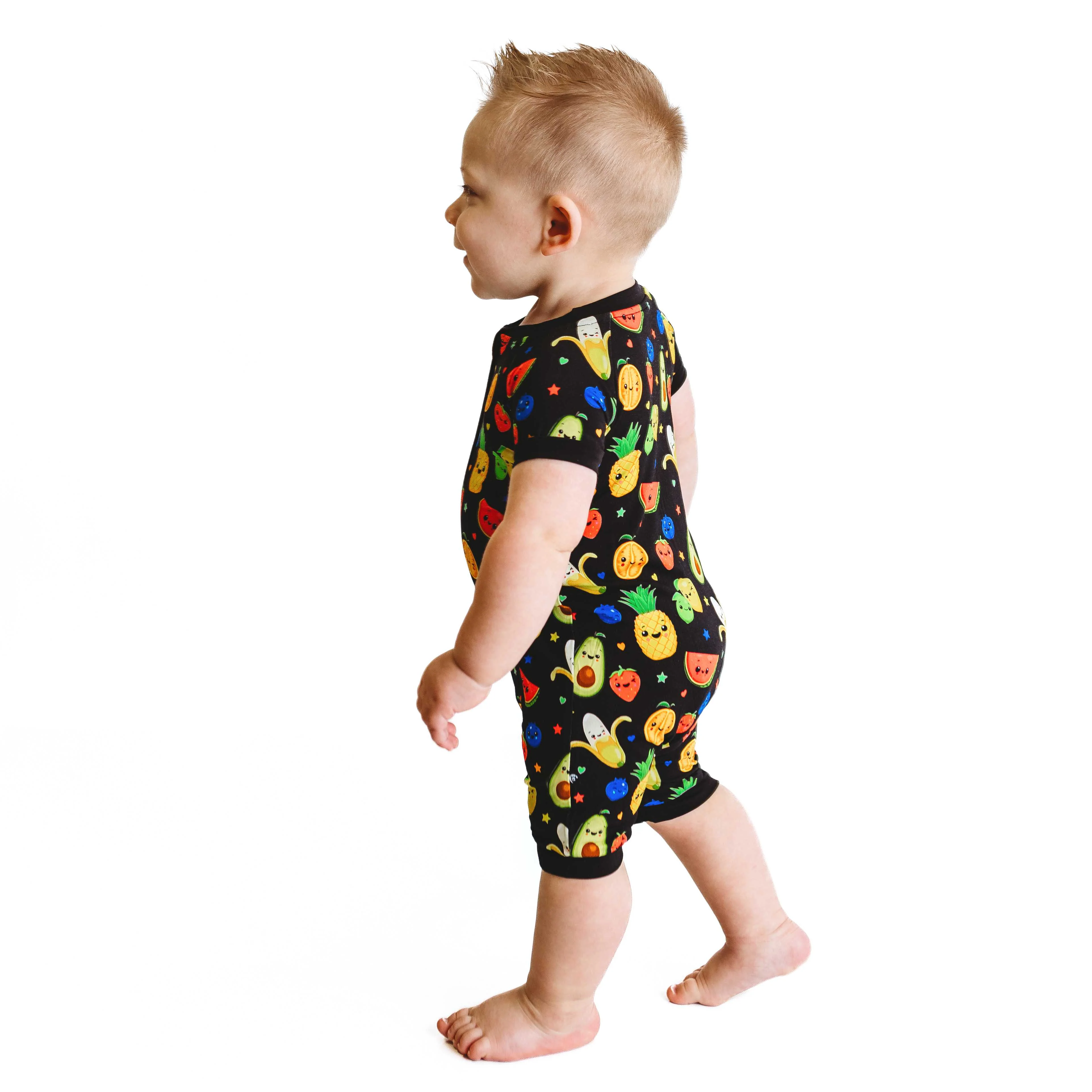 Super vibrant, soft and colourful! The Smoothie Mix Shortie features all of your favourite dancing fruit characters Avocado, Pineapple, Orange, Blueberry, Lemon, Lime, Banana and Strawberry! Made from breathable, hypoallergenic, stretchy Bamboo, these are perfect for play and cozy cuddles!